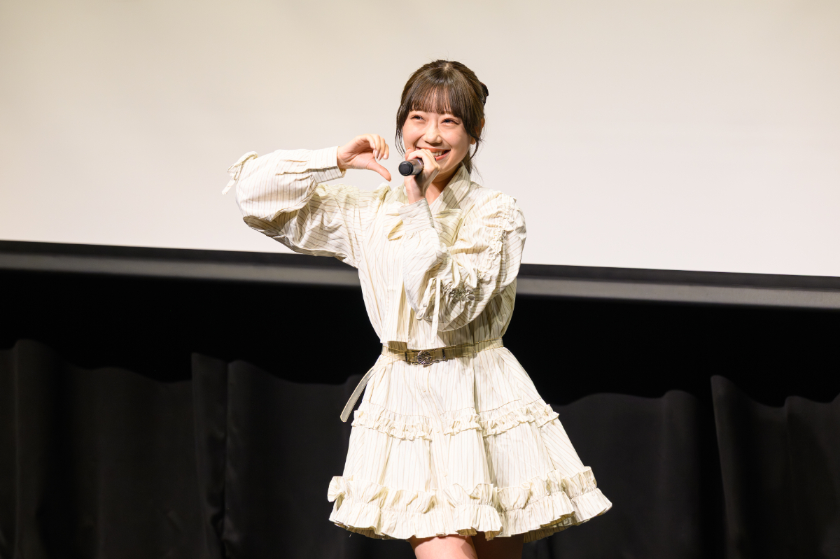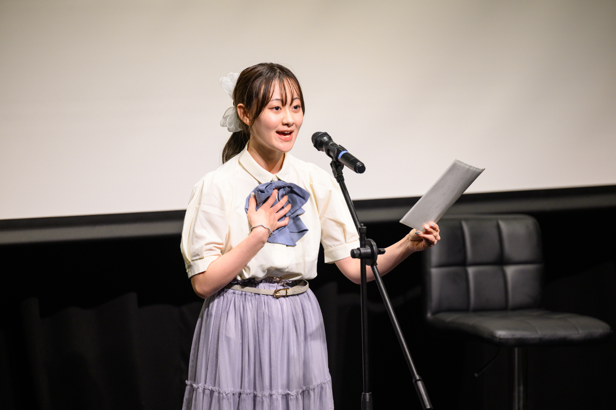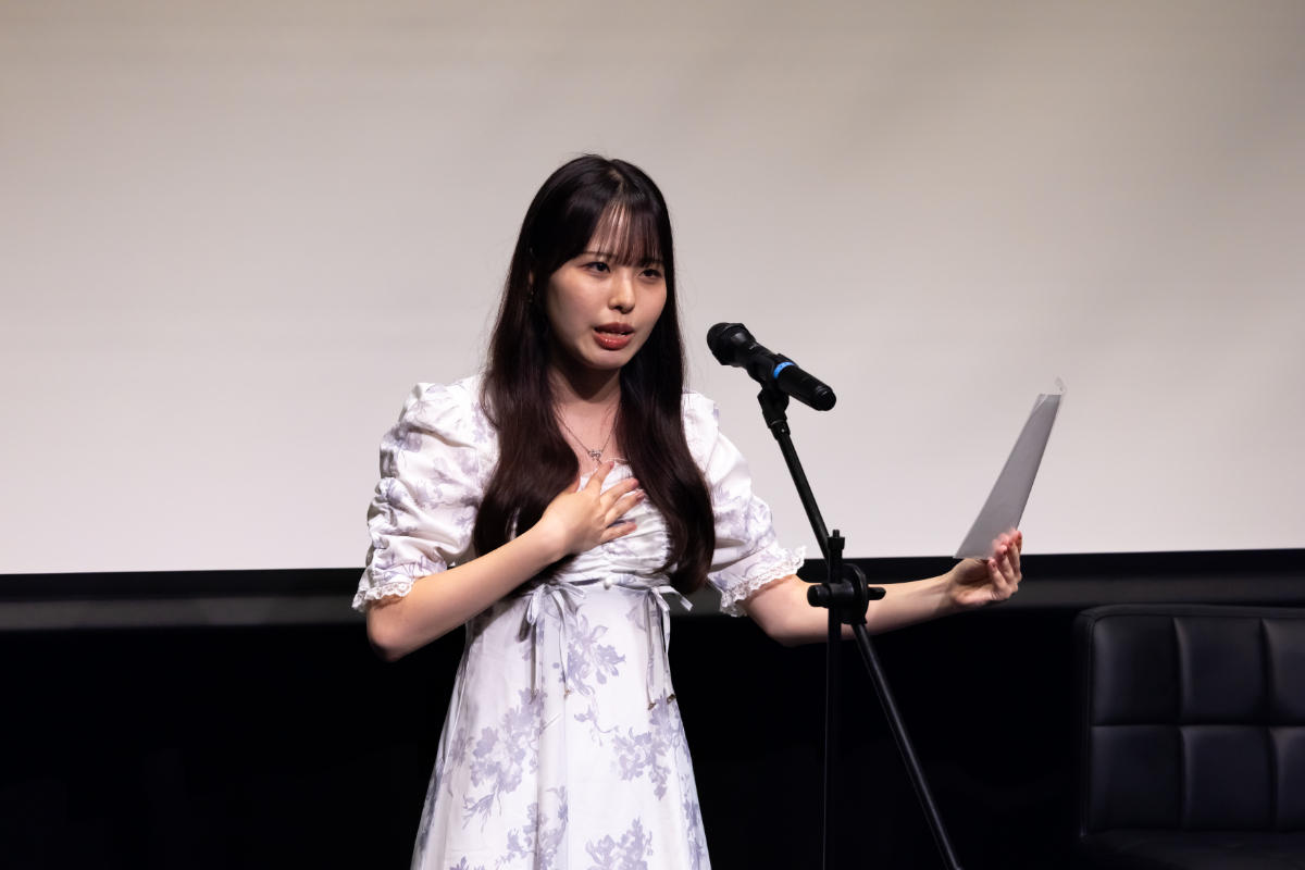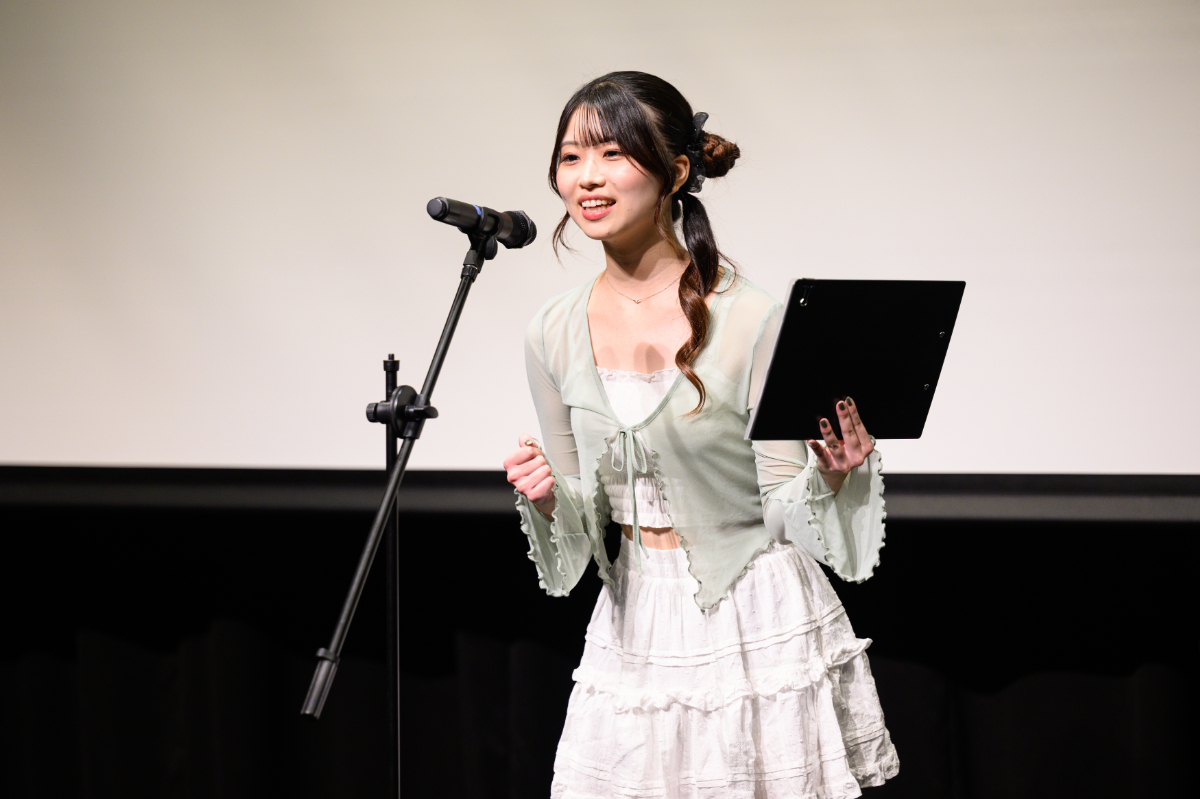 「持ち前の明るさでパワースポットのような声優になります」と宣言し、少女の声で「大好き!笑ったときの顔も、優しい声も全部大好きなんだ」と演じます。