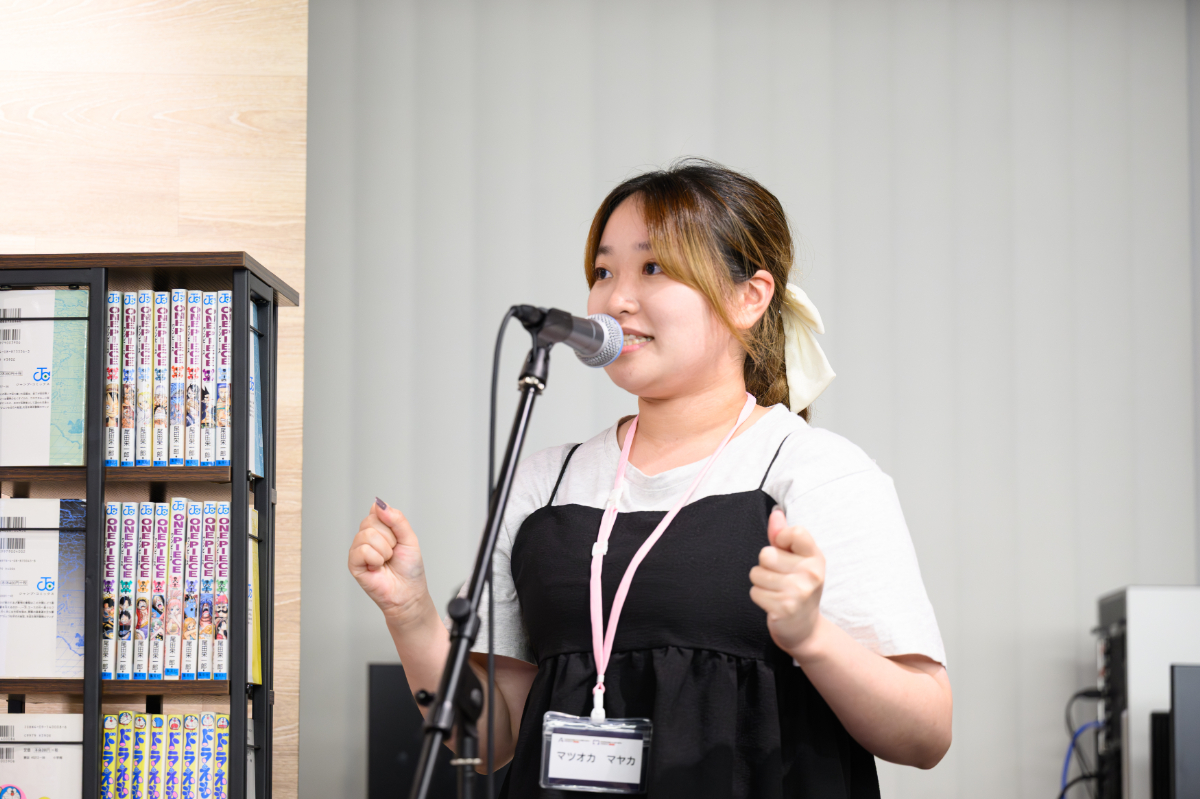 H.K さん「演技のチャレンジでは、どんなお題がくるのかわからなかったので、とても緊張しました!でも、会場にいるお客さまが楽しそうに聞いてくださったのがうれしかったです」と振り返ります。