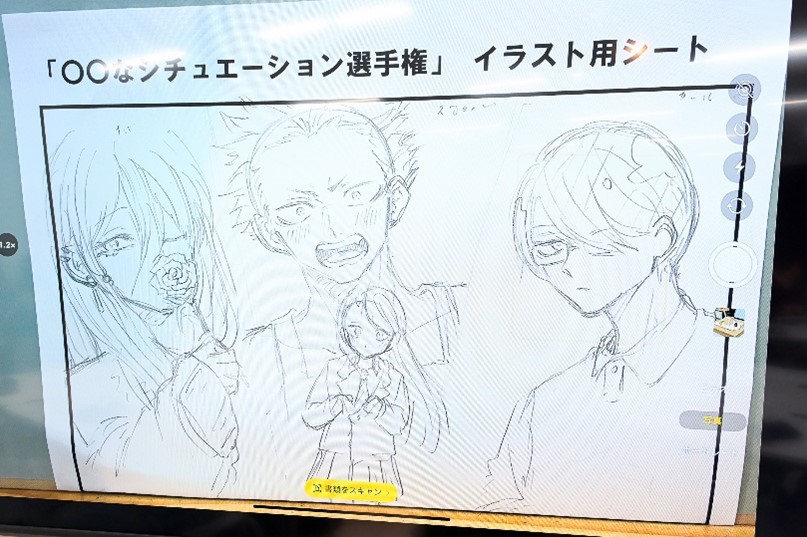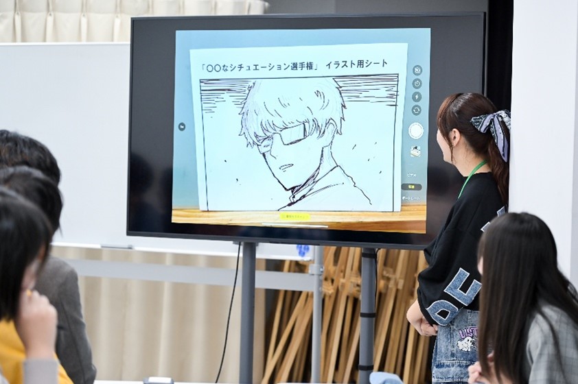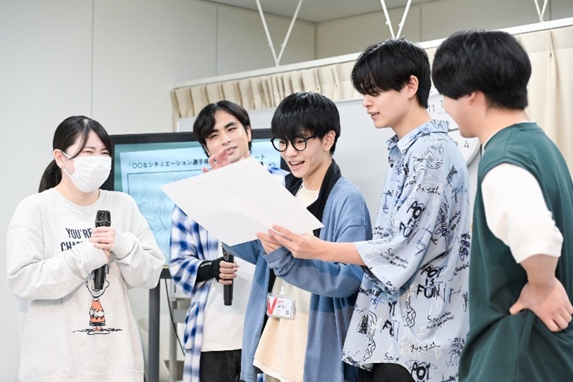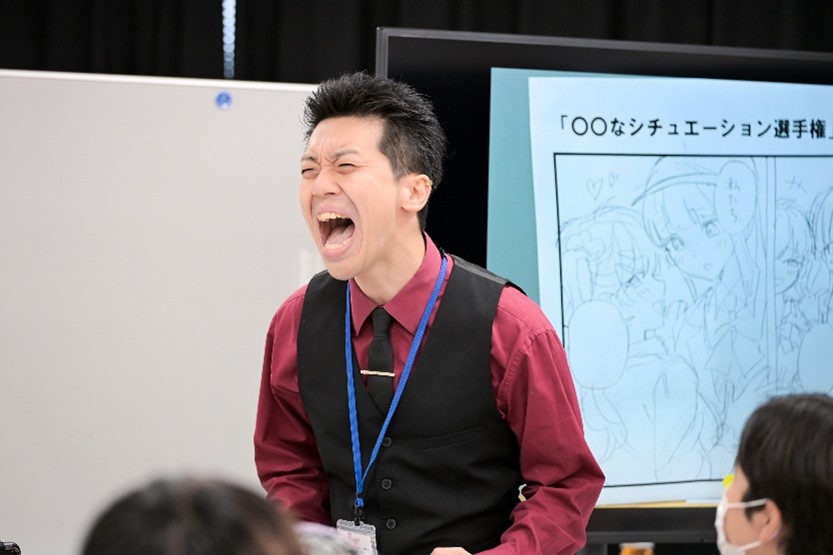ここからはチーム制作。「〇〇なシチュエーション」をテーマに、ノベル専攻生がセリフを書き、マンガ・イラスト専攻生がマンガの1~2コマを描き、声優専攻生が台本をもとにアフレコを披露します!