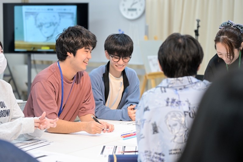 後半では、与えられたお題に対してノベル専攻、マンガ・イラスト専攻、声優専攻の学生が協力してのグループワークも実施され、異なる専攻の学生たちが同じグループになり、1グループ5~7人でクオリティを競いました。