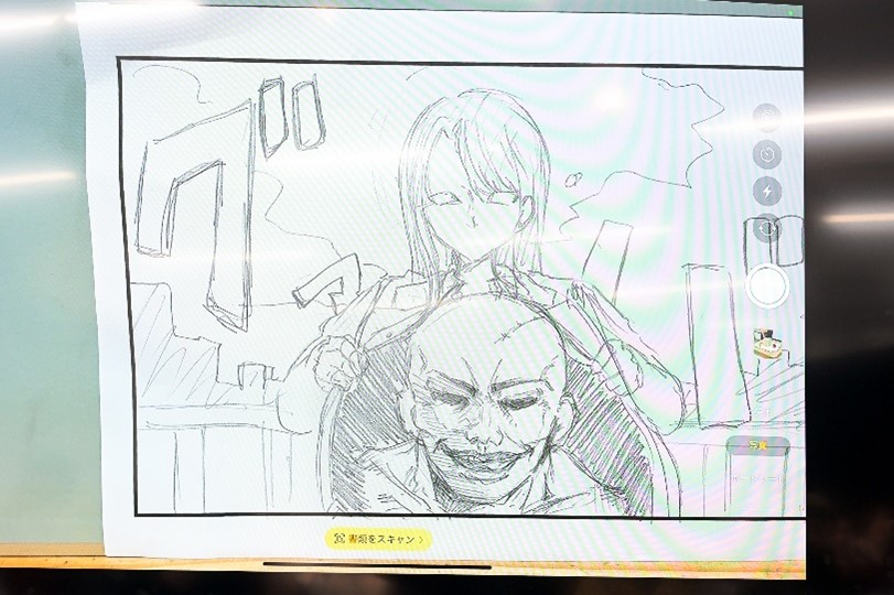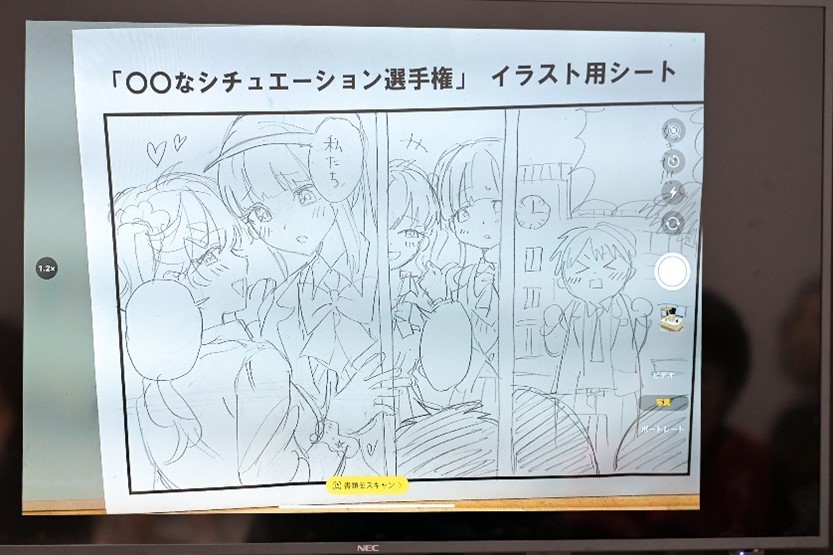 限られた時間内で、ノベル専攻生がセリフを考え、その横でマンガ・イラスト専攻生が同時進行でマンガを描いていきます。