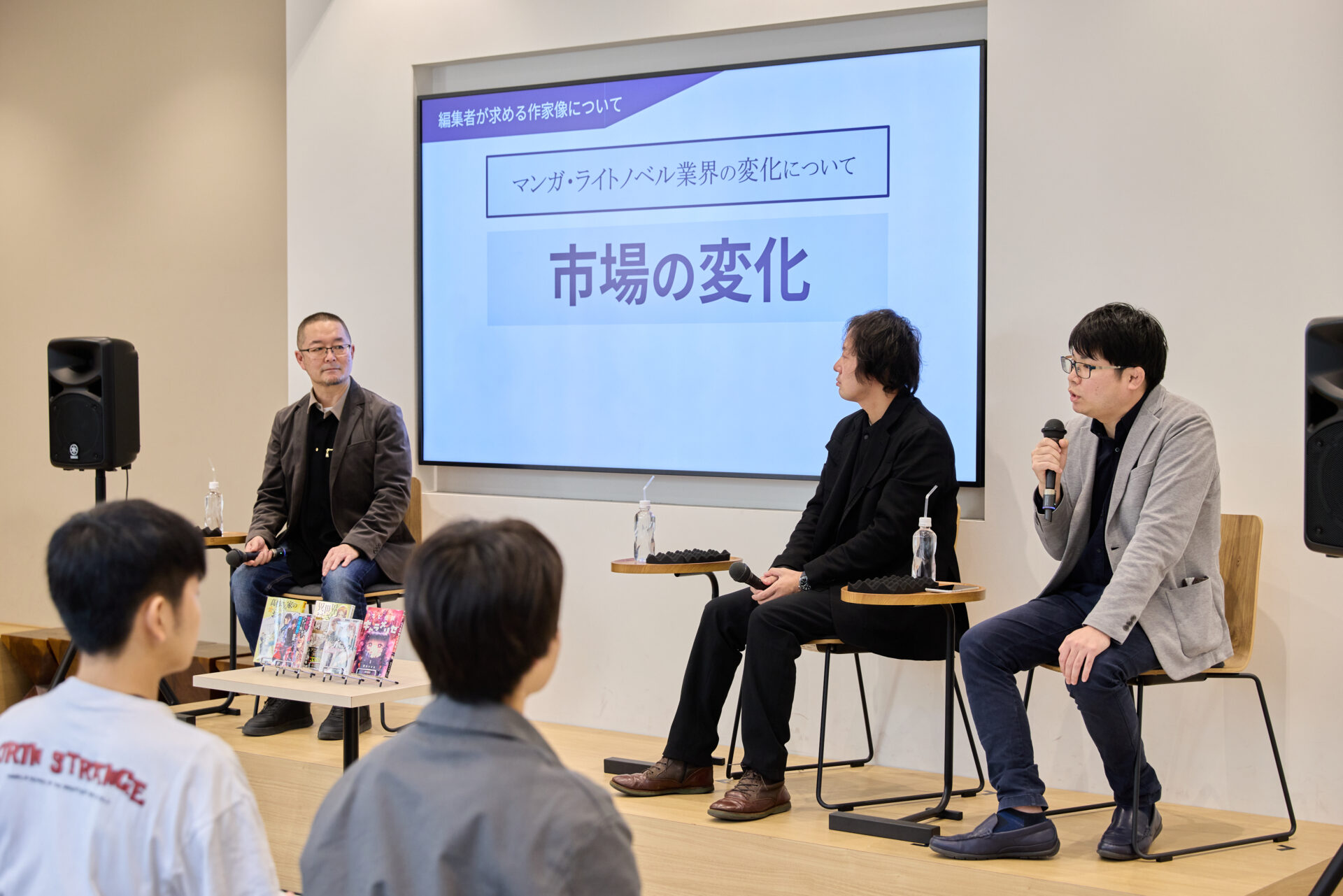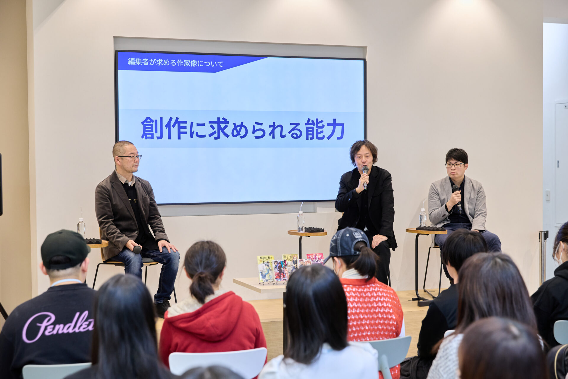 将来クリエイターを目指す若者を前に、マンガ、Web雑誌、ライトノベルの各分野を牽引する編集者が登壇。業界の動向から、編集者が共に仕事をしたいと願う「作家像」まで、実践的な知見が語られました。