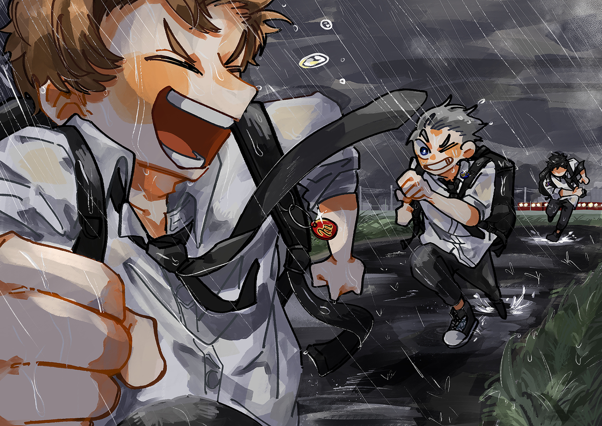 ダッシュ・ザ・ゲリラ!!! 下校中に遭遇したゲリラ豪雨に、傘など持っているわけがない男子高校生トリオがダッシュで帰っている「時」を切り抜きました!お揃いのキーホルダーが仲良しの印!とびきり笑顔ではしゃいでもらいました!
